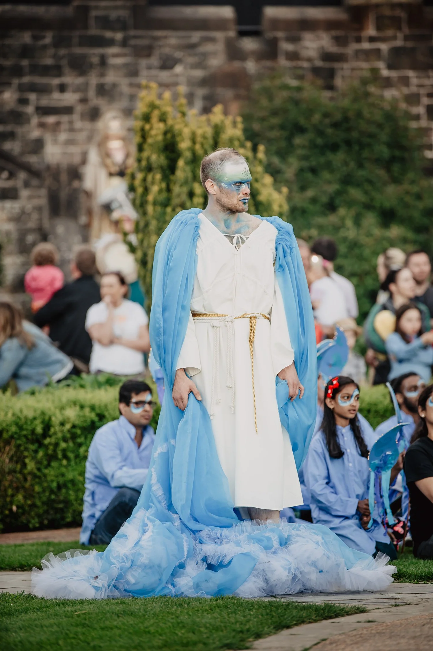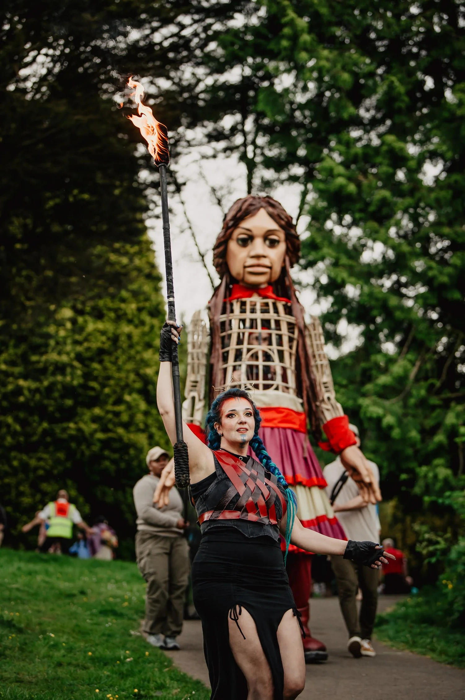 As Amal’s journey in Belfast came to an end, we gathered in the grounds of Belfast Castle at Beann Mhadagáin to bid her farewell. There, she was met by four Tuatha Dé Danann; ancient deities of Ireland who reside in the otherworld. An Dagda, who came representing Earth. The Morrigan, who came representing Air. Bríd, who came representing Fire. And Manannán Mac Lir who came representing Water. In a ceremony of music fire and dance, they bestowed blessings on Amal, offering their powers of protection for her onward journey.